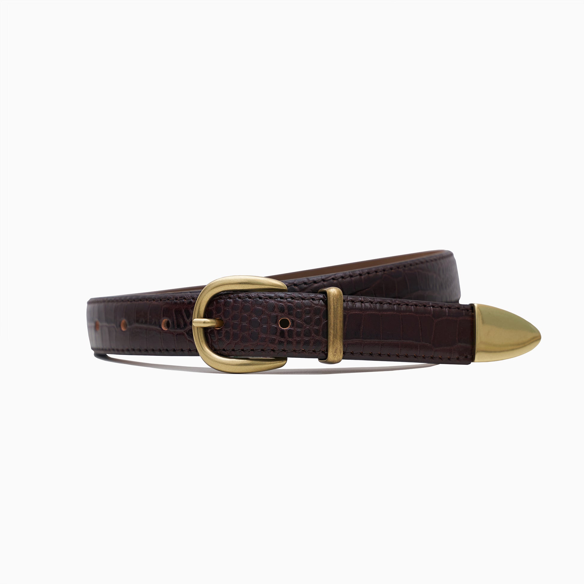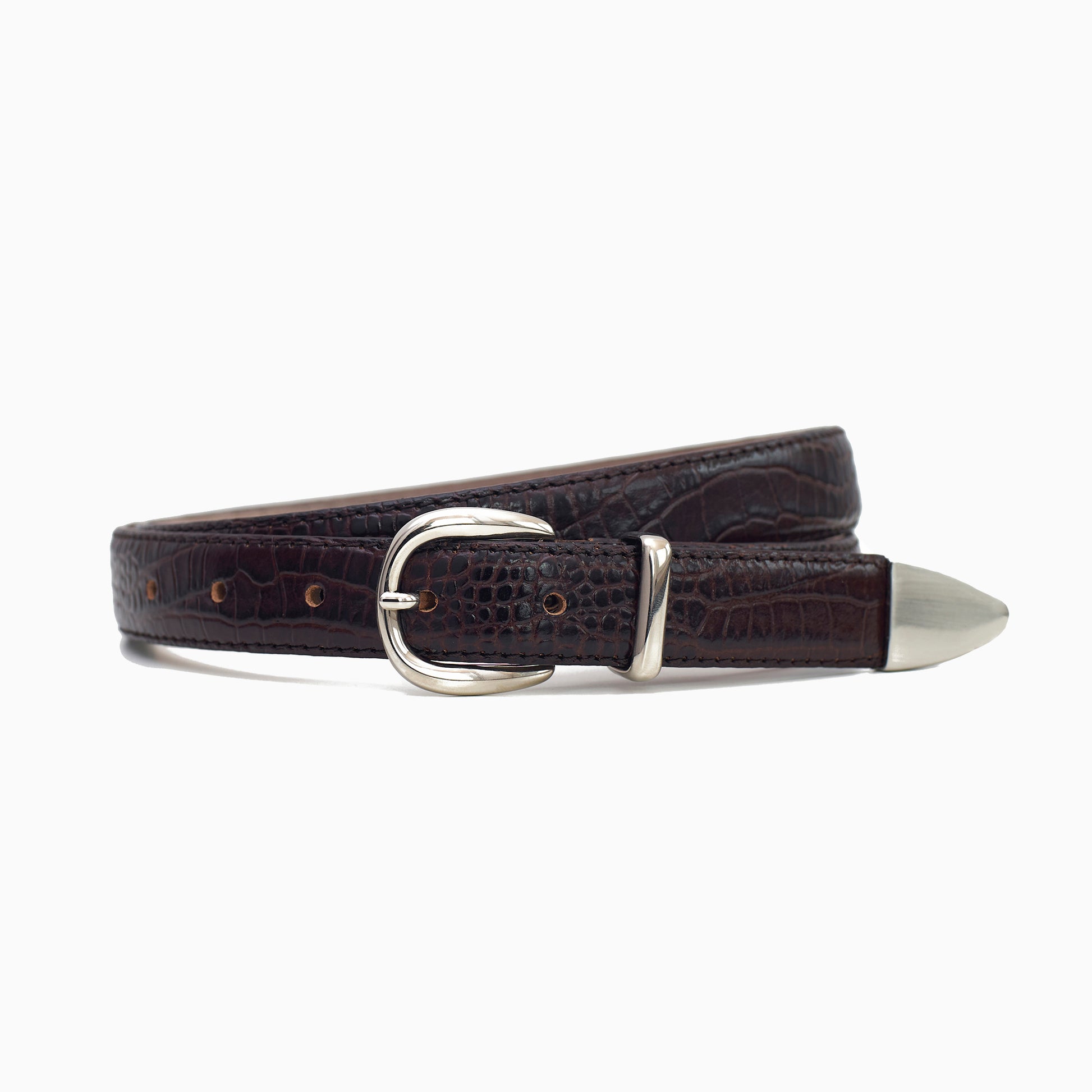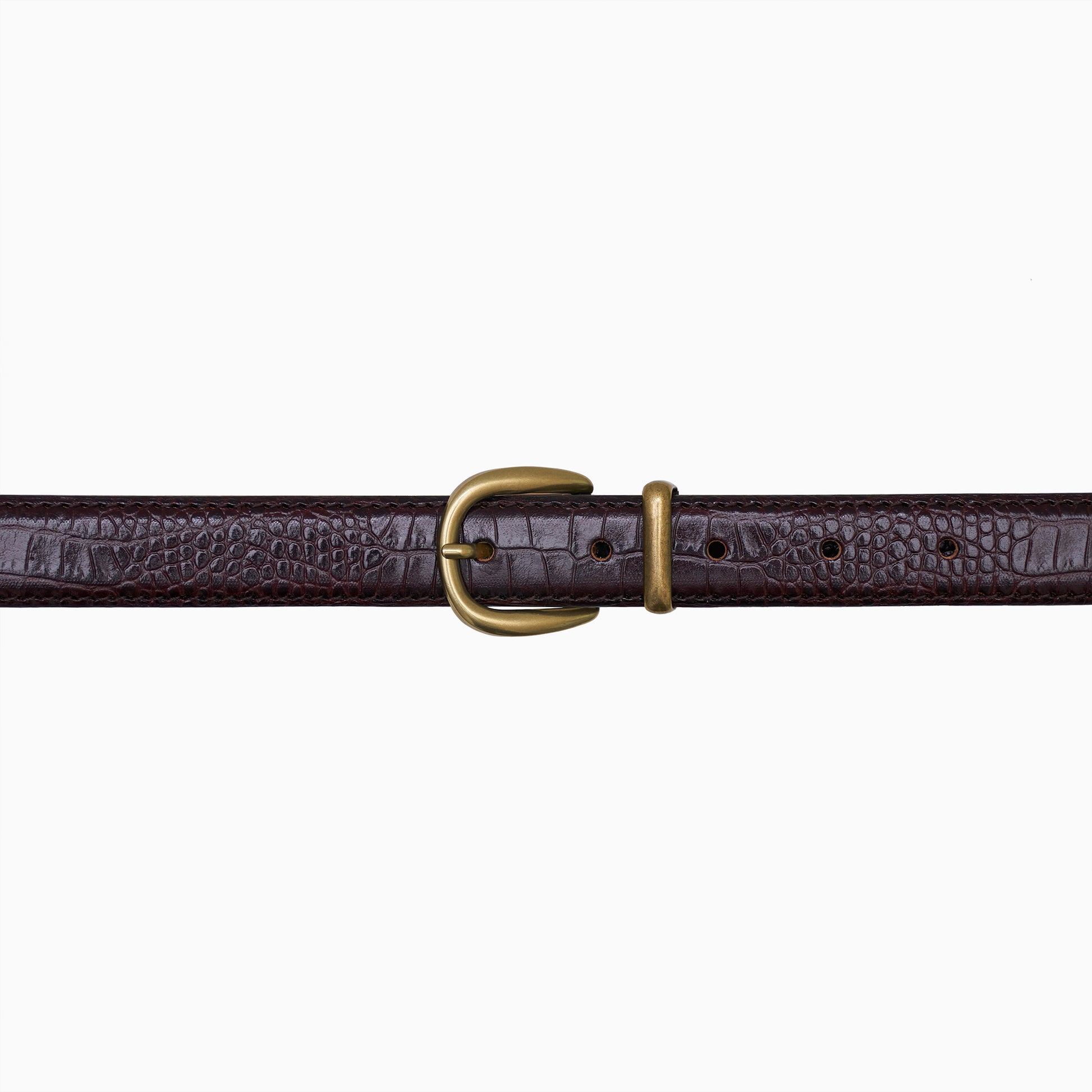 Wersja „Tryptyk” naszego paska o szerokości 1 cala (2,5 cm) to dodatkowo podkręcona propozycja dla tych, którzy cenią sobie wyraziste detale. Potrójne okucia — klamra, szlufka i końcówka paska — tworzą spójną, przyciągającą wzrok całość. W połączeniu ze skórą tłoczoną we wzór krokodyla całość zyskuje subtelnie odważny charakter, który sprawdzi się zarówno z dżinsami, jak i z eleganckimi spodniami.